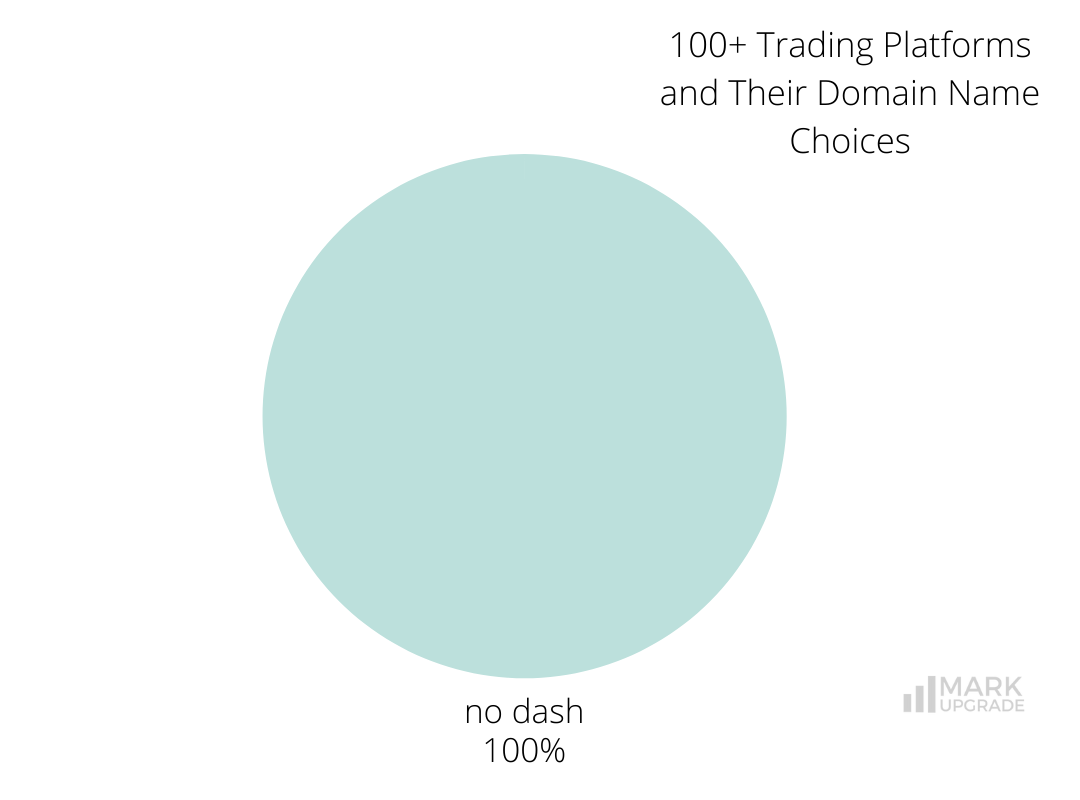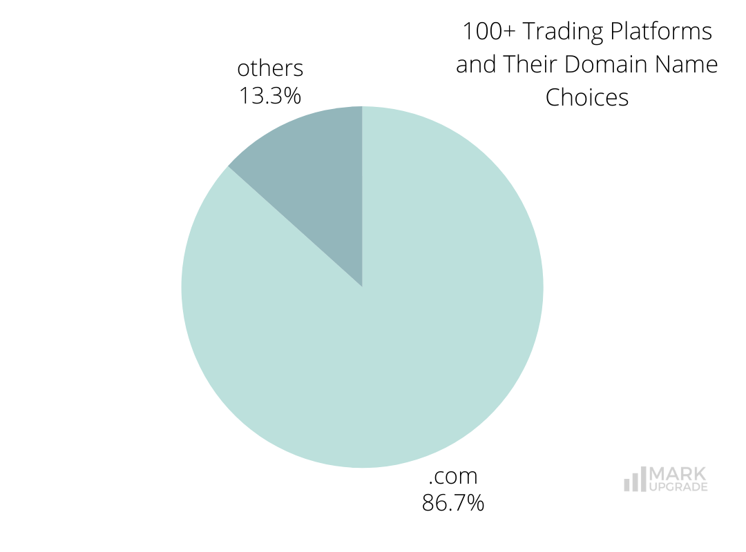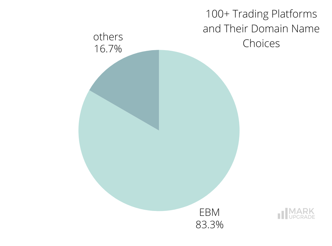 Our analysis of 120 trading platforms shows a clear preference for Exact Brand Match (EBM) domains combined with the .com extension. Out of the total, 100 platforms operate on an exact brand match, using a domain that fully aligns with the brand name.