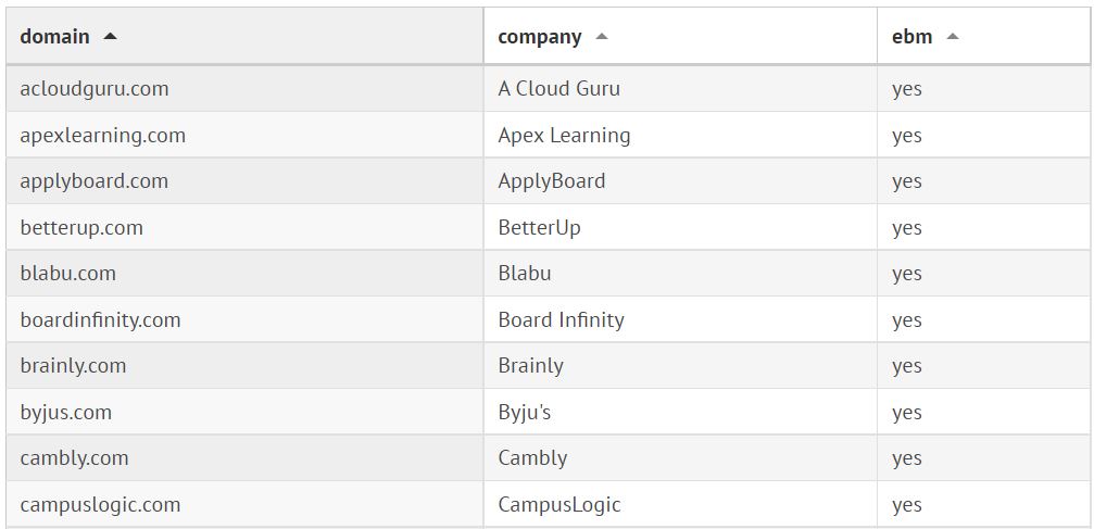 Eighty-four edtech startups out of ninety-nine are using the .com extension domain name. Some companies on the list converted common and popular education industry words into catchy names for their brands as Lessonly, Teachoo, and Quizlet. It’s a frequent technique to create a name for a new business because matching .com is more likely to be available or easier to get.