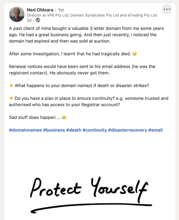 Lesson: Every domain owner, regardless of age or health, should have a plan for their digital assets. Without clear instructions and access details, domain names can expire and be sold without benefiting the family or estate. Secure storage of login credentials, trusted oversight, and inclusion in estate planning can prevent such losses.