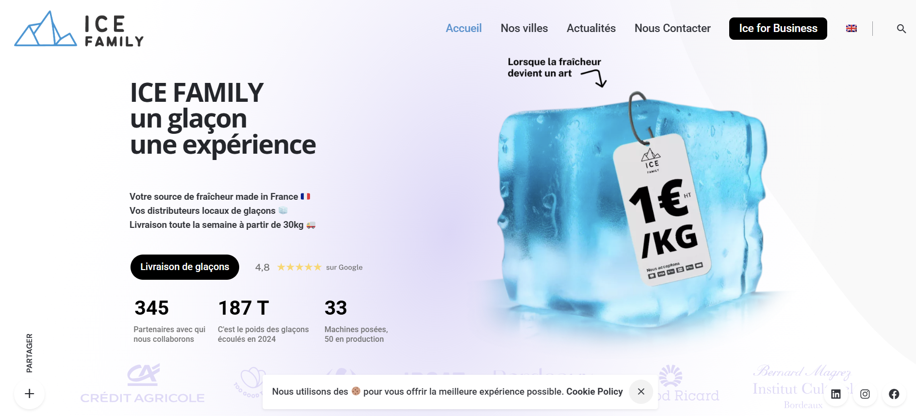 Ice Family, founded in 2022 by Eugénie and Timothée Fargeaudoux in Bordeaux, France, specialises in the production and distribution of high-quality ice cubes. The company offers home delivery services and operates self-service ice dispensers in strategic locations, ensuring convenient access for customers.