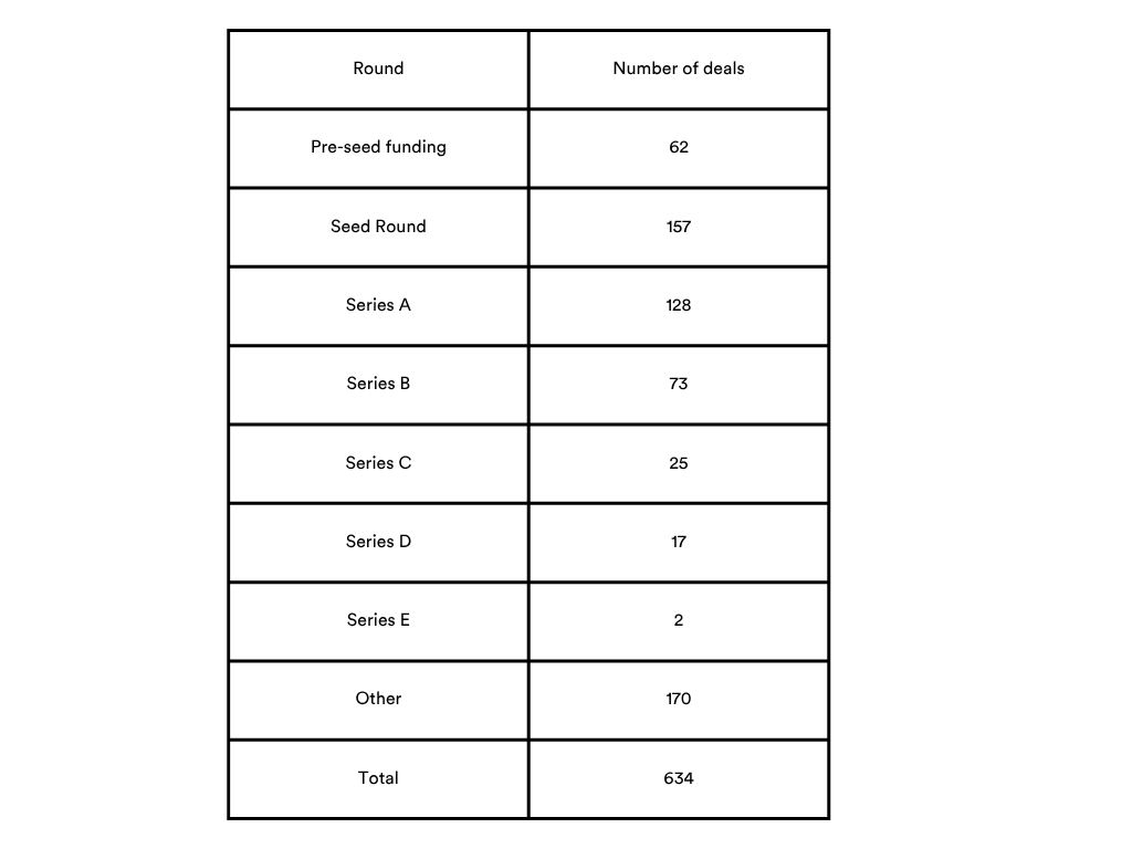 Early-stage funding remained strong, with increases across Pre-seed, Seed, and Series A in deal count and amount raised. Pre-seed rose from $115.7M to $132.8M, Seed from $1.06B to $1.12B, and Series A from $2.41B to $2.68B, indicating continued investor interest in emerging companies.