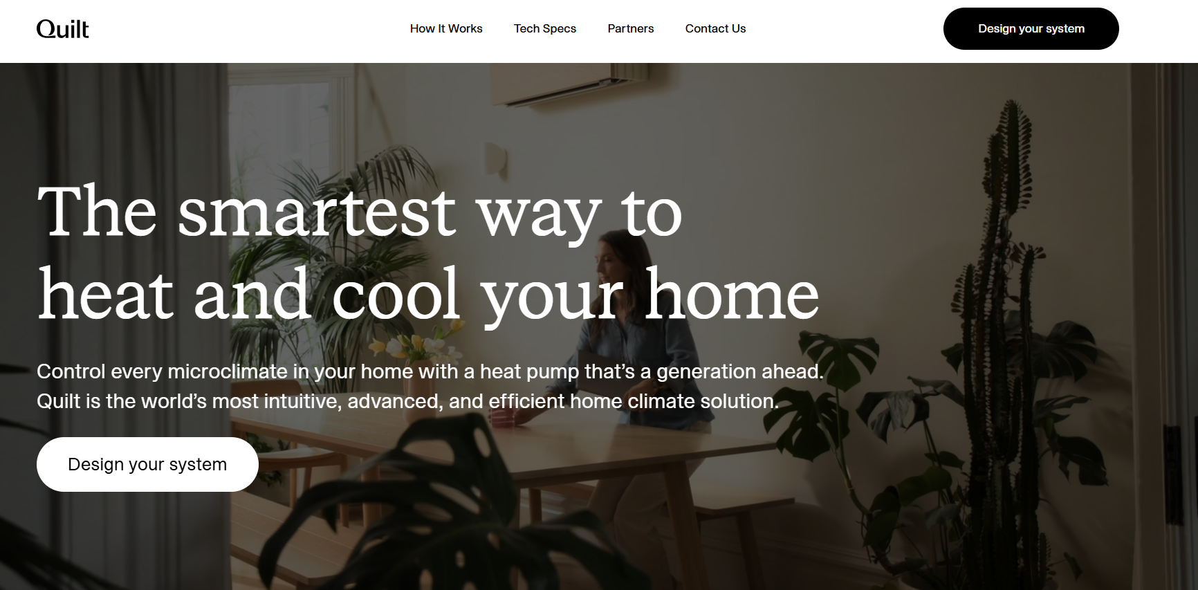 Quilt is a smart home climate company developing a more intelligent way to heat and cool homes. Its electric heat pump system gives homeowners room-by-room control while helping to reduce energy use and cut emissions. Designed by a team with experience at Google, Apple, Nest, and Tesla, the system combines efficient hardware with intelligent software and a clean design that fits seamlessly into any home.